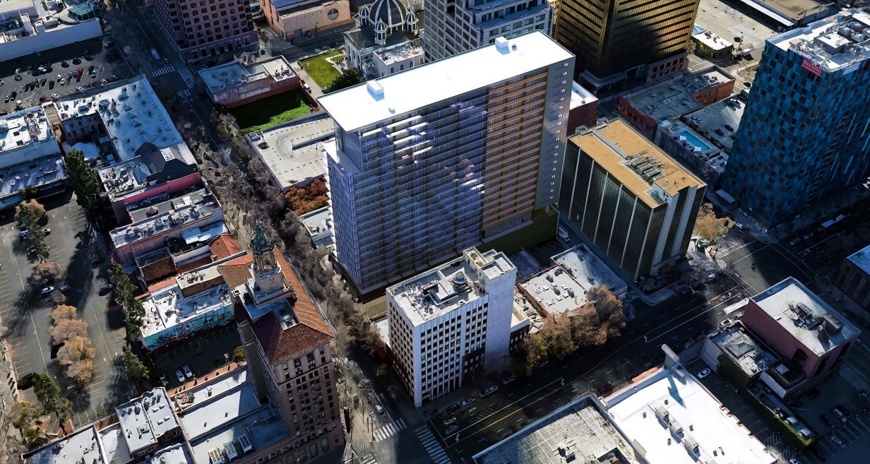 An aerial view of downtown San Jose's Tower 27 residential mixed-use tower, in a visualization. A new 24-story residential tower and new retail space are being planned for downtown San Jose, a development that aims to help revive a decaying...