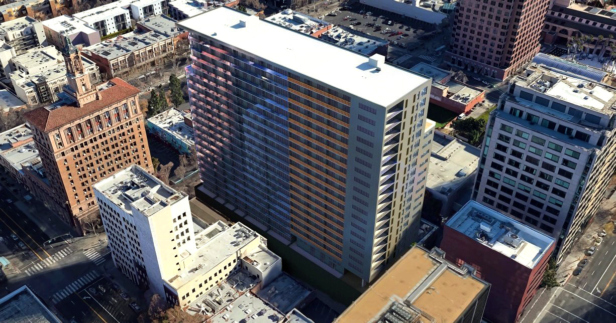 An aerial view of downtown San Jose's Tower 27 residential mixed-use tower, in a visualization. A new 24-story residential tower and new retail space are being planned for downtown San Jose, a development that aims to help revive a decaying stretch of South First Street in the city's urban core. t27silicoin.com