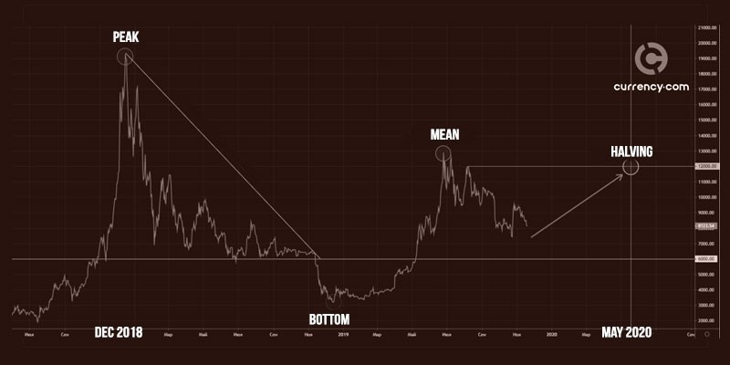 In December 2017, the peak hit $ 19,794, followed by a recession, the bottom at $ 3,148 and recovery. Today we already know the recovery price or the average value from the previous peak - $ 13,830. If you follow the logic of the resulting model, the price will return to about $ 12,000 by the date of halving. Why?